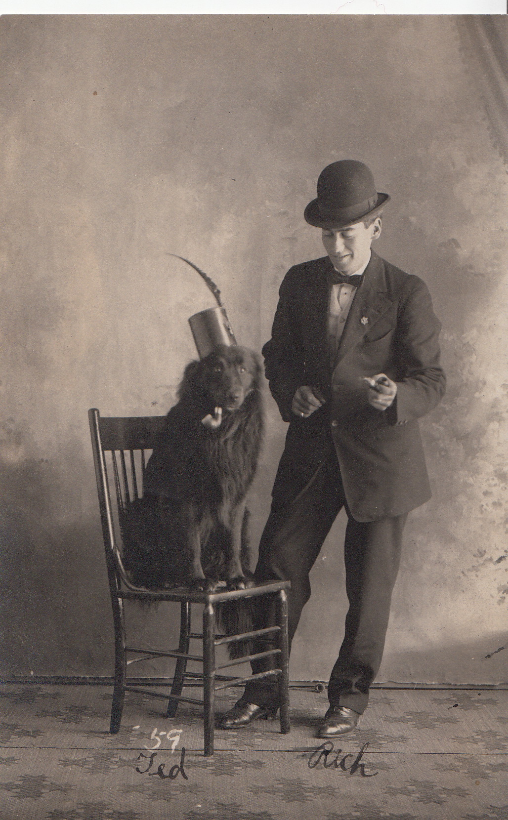 Dressed in a suit, bowler hat, bow tie and polished shoes, Rich looks down at Ted, who I think we can assume is his dog. Their names are written in pen at the bottom of the card. Sitting on a straight-backed chair, Ted looks straight into the camera, clutching a pipe in his jaws and wearing a fez that seems to have been improvised out of a can decked with a feather. Rich has a pipe in his left hand, too. I guess this is intended to be a picture of two pals enjoying a smoke…. I gave a talk last night in Maryland where found myself discussing the humor associated with pet keeping at some length. Pet keeping is often a form of play.