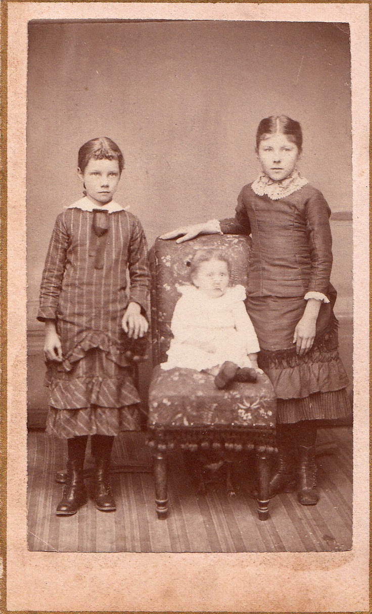 But this little carte-des-visite shows something I have never seen before. Dating from the late 1870s or 1880s, the photograph by Will W. Hall of Northwood, Iowa, depicts a family of three little girls — and a small dog sitting under the chair. I’ve provided a detail so that you can see him. I surmise that he thought the entire process was for the birds and took refuge under the long fringe of the chair’s slipcover.