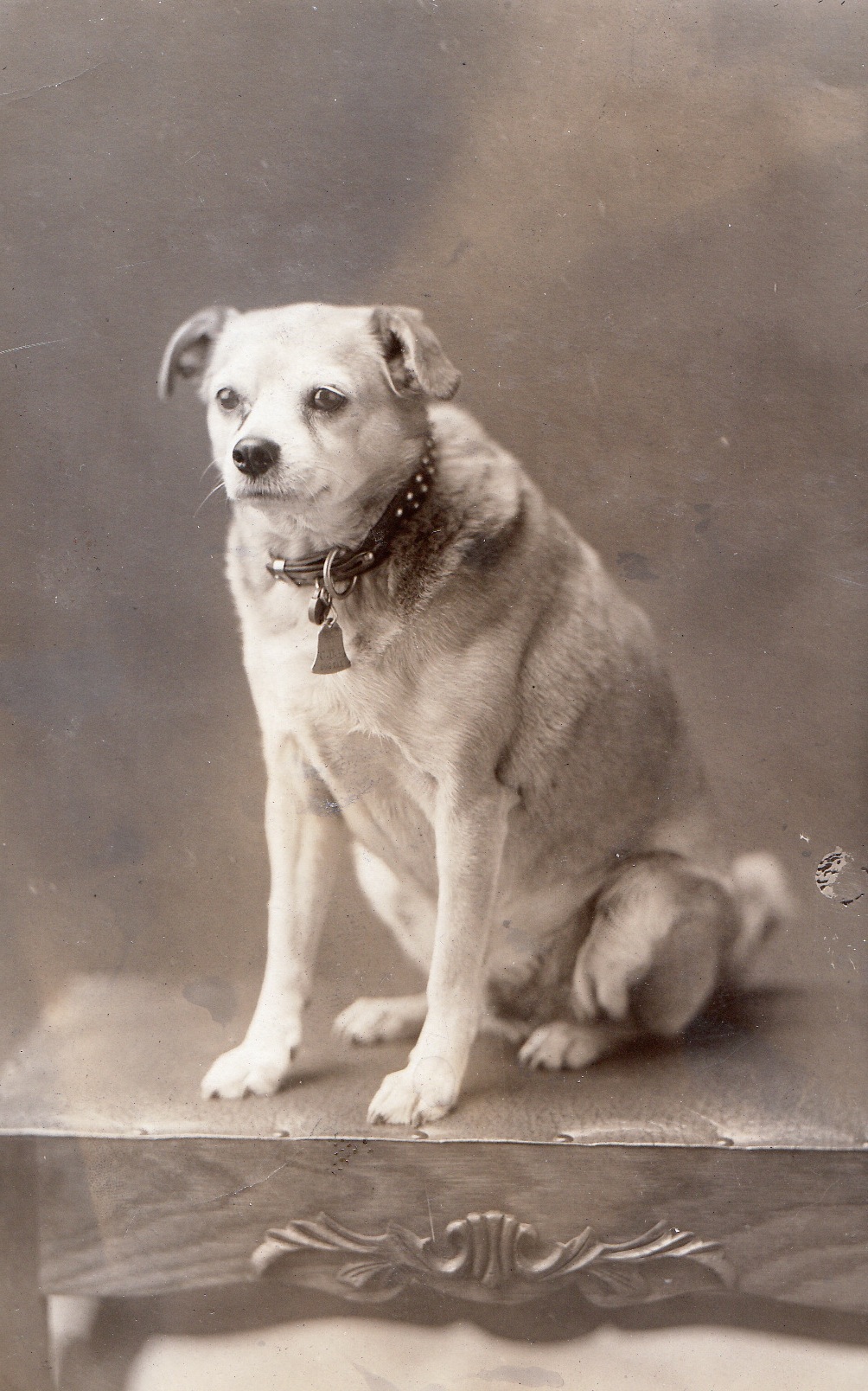 Professional photographers often produced photo postcards for their clients through the 1930s. Except for using the table as a platform to get the little dog off the ground and closer to the camera lens, the approach of this photograph mirrors formal portraits of people in the use of a “three-quarter” view.