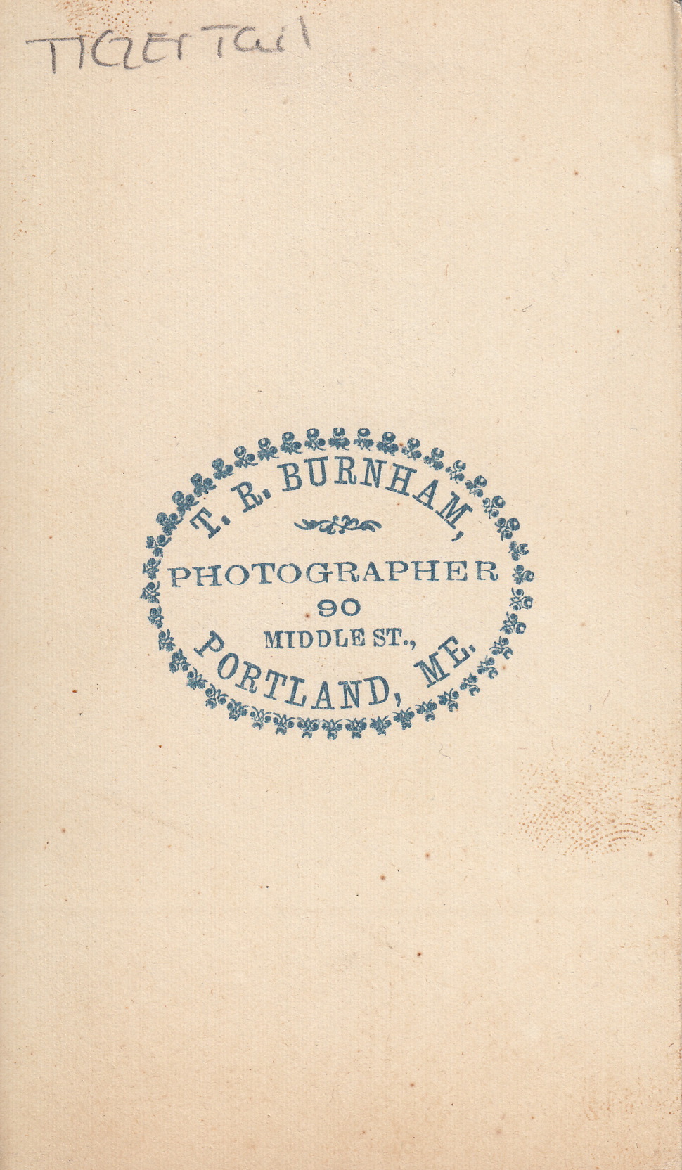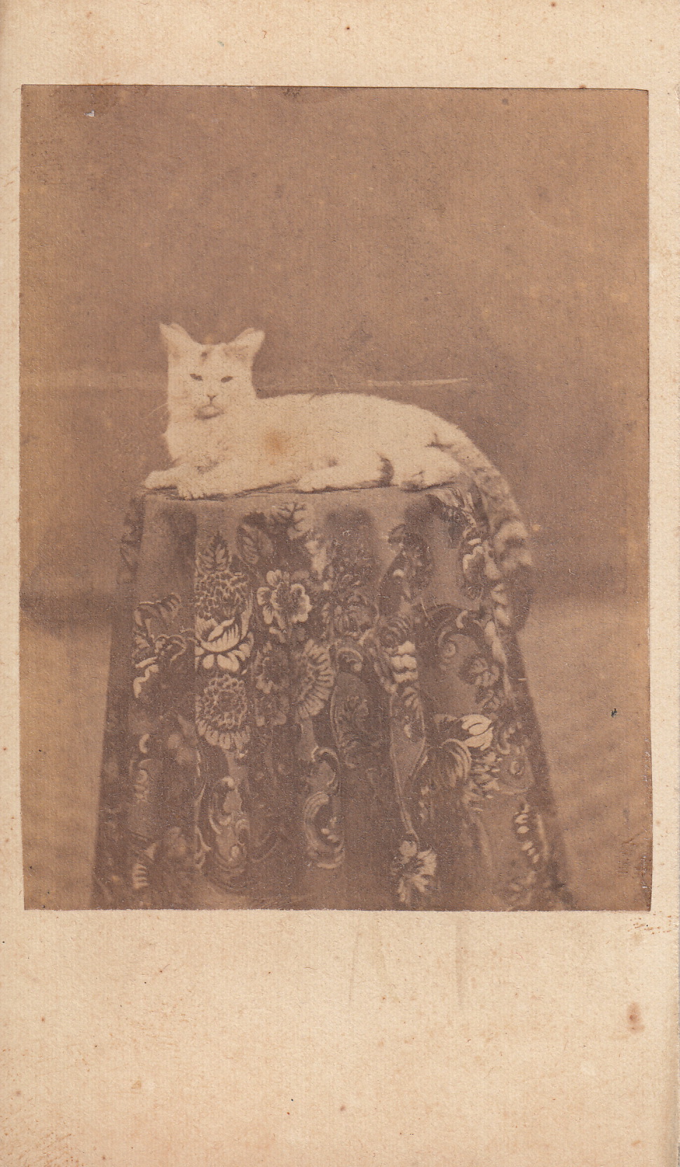 This may not have been the first time T. R. Burnham published a photograph of Kitty Burnham. I found this carte-des-visite, published by Burnham in Maine before his move to Boston, and the nonchalant expression, spots on the head and tiger tail of this cat look like Kitty Burnham to me. The back of this card has a pencil inscription — “Tiger Tail” — but its author and date are unknown. This was another album filler and publicity card for Burnham, but when you put the two cards together, they suggest a long and affectionate relationship between T.R. Burnham and Kitty.