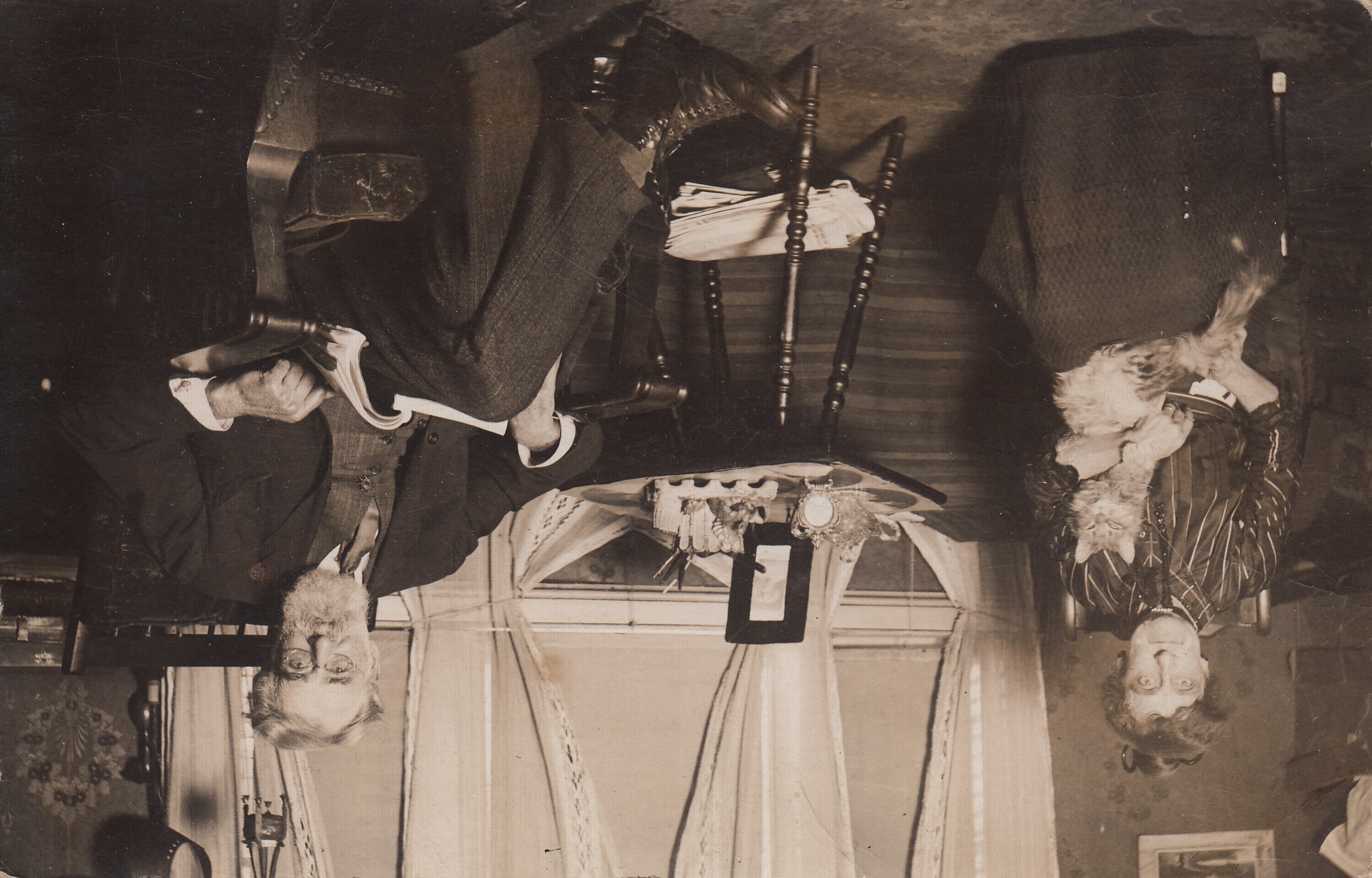 Unfortunately, there is no information on the postcard’s back about who this couple is; from the furniture and clothing, I guess that the photograph is from around 1915.