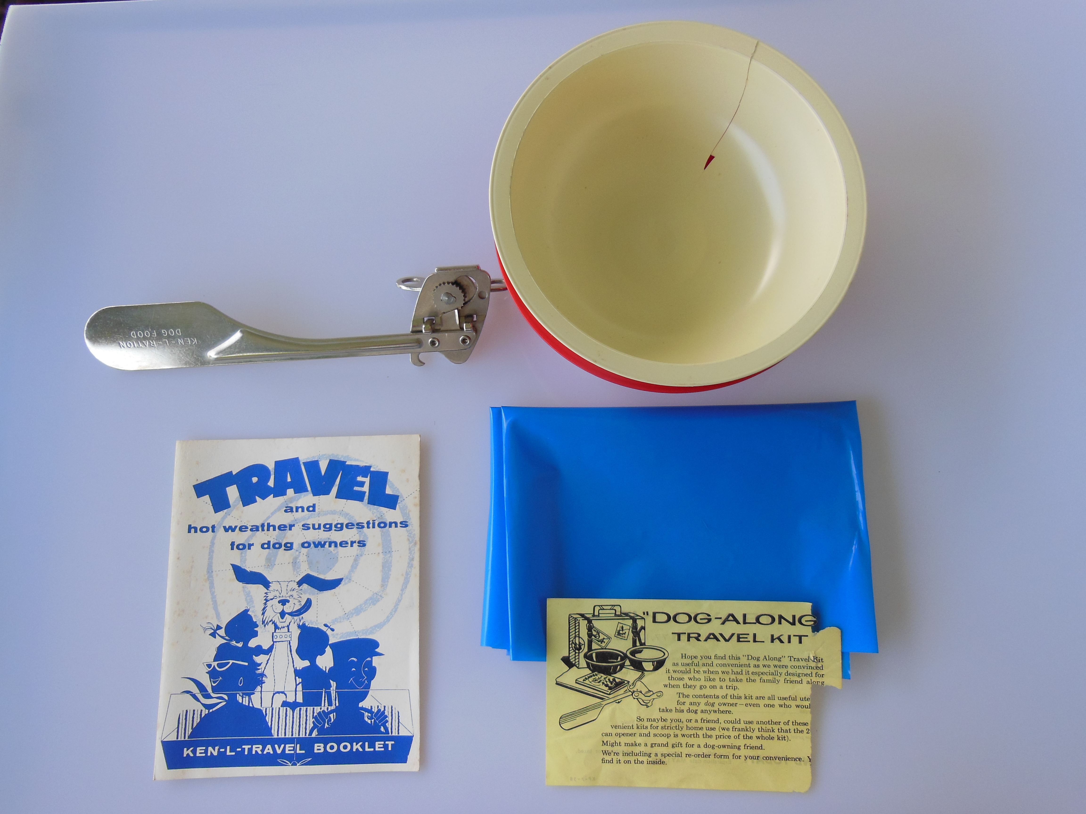 Of course, the well-traveled family dog needed to be able to dine and drink in comfort on the road. A number of novelty companies produced inexpensive travel kits with bowls, place mats, can openers and bottles for water. This one was a premium from the Quaker Oats Company, which owned Ken-L-Ration at that time. The cardboard “suitcase” has a design of travel decals, suggesting that the family dog was as well traveled as the rest of the gang. — notice the one for Disneyland. The brochure offers advice on traveling with a dog in hot weather.