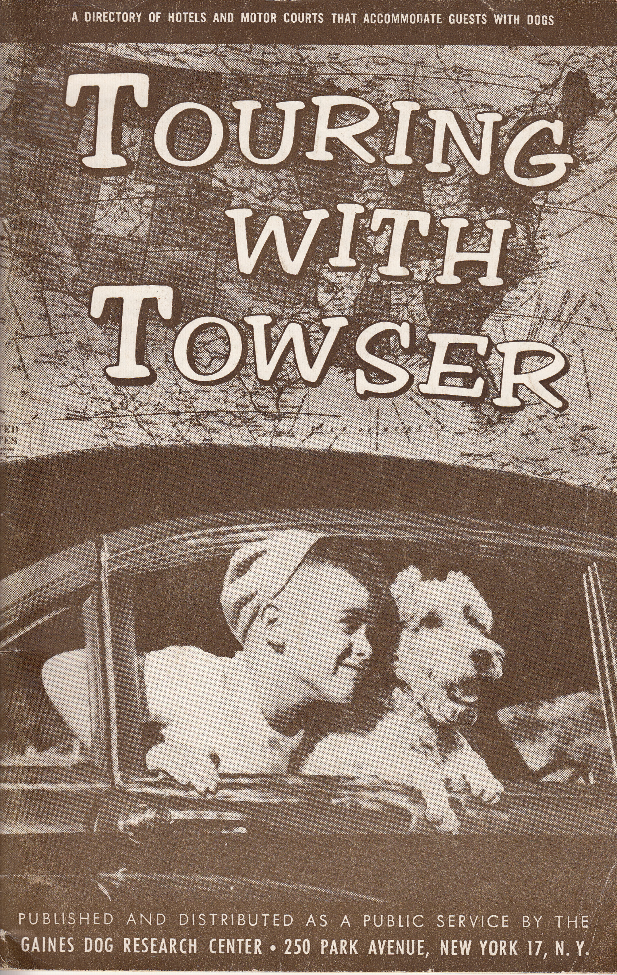 Of course, not all family dogs had to rough it like this. In 1960, the Gaines Dog Research Center, a unit of the Gaines dog food company, published this small paperback booklet, Touring with Towser. It contained nothing more than a list by state and town of hotels and motels (“motor courts”) that were willing to accept dogs.