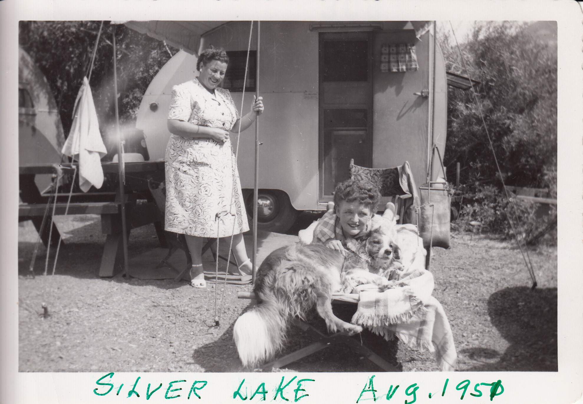 After World War II, as more American workers received vacation days as part of the terms of their employment, trailer vacations became even more popular — and family dogs went along. This 1951 snapshot taken at an unidentified “Silver Lake” (there are a number of them), shows two women and their collie dog at their campsite.
