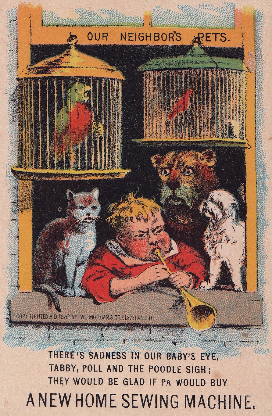 Pet keeping has been a subject for occasional satire for a long time. In the future, I’ll offer a post on satires of “lady’s pets,” lap dogs in particular. This small trade card offers a distinctively Victorian satirical take on pet keeping by equating the obnoxious small boy and the array of animals: everyone in the window is a “pet.”