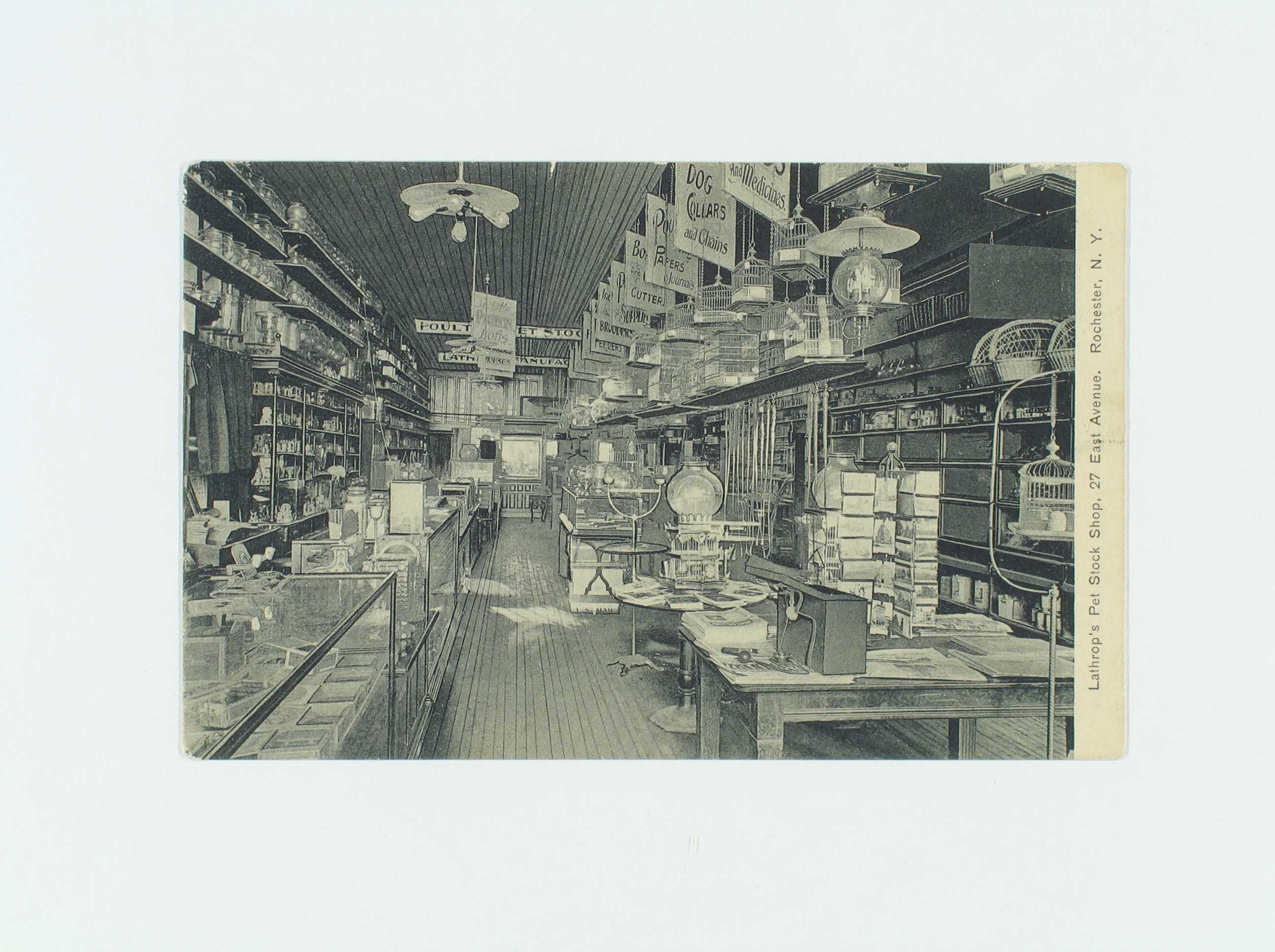 On December 18, 1906, Lathrop’s Pet Stock Shop in Rochester, New York, mailed this postcard to a local customer. The message on the back offered “the best appreciated Holiday gifts,” including “Canary Birds of all varieties,” other song birds, gold fish, parrots, dogs, cats, and squirrels. The shop also carried “Medicines for every known pet” and offered free advice to pet owners, who for the most part did their own doctoring.