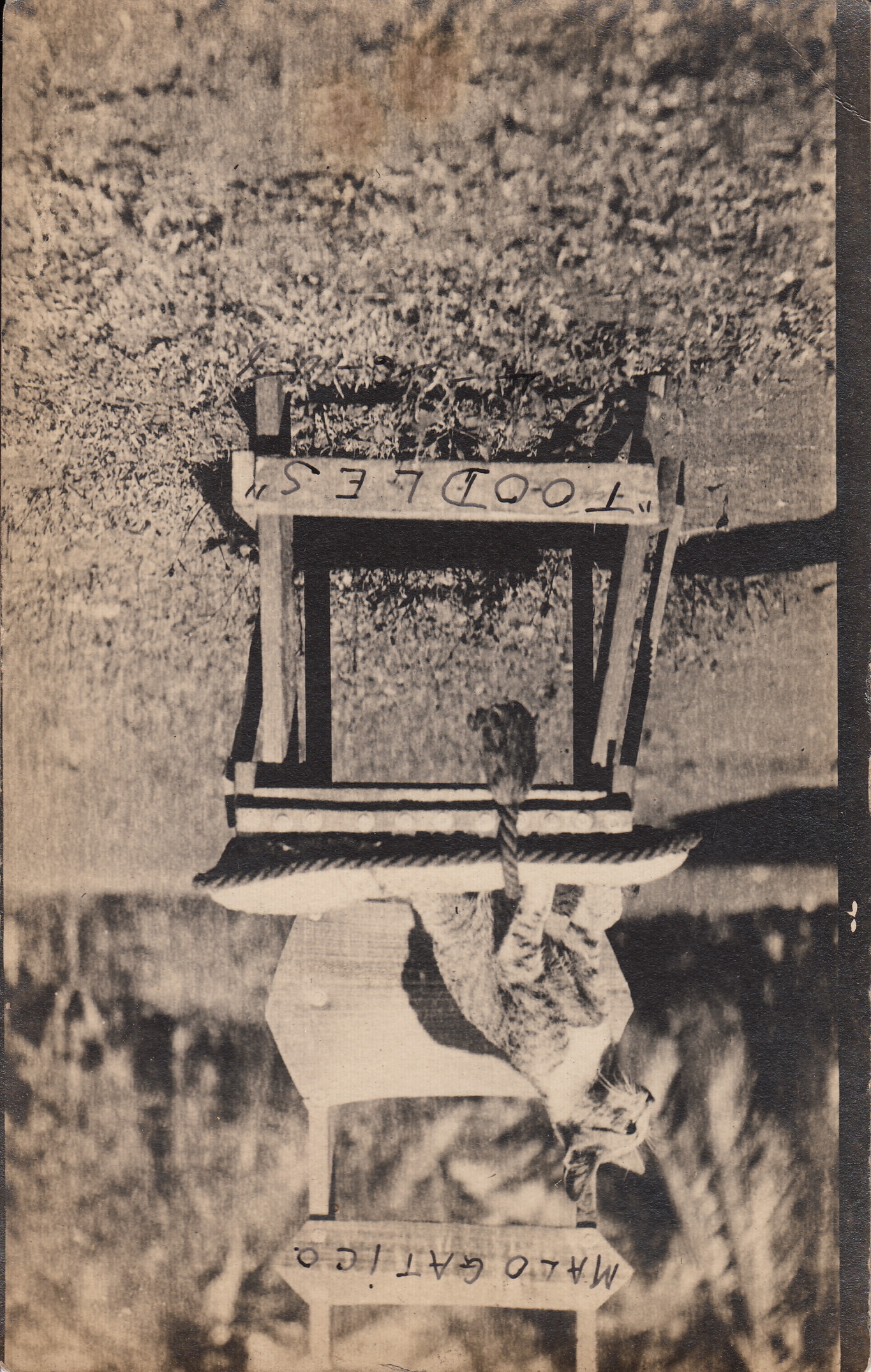 Unfortunately, this wonderful snapshot postcard has no identifying information on the back. The writing was added after the postcard was printed. Toodles does look like a cat with an attitude. We can’t see his eyes, but he does have crazy ears, and his body is coiled for attack!