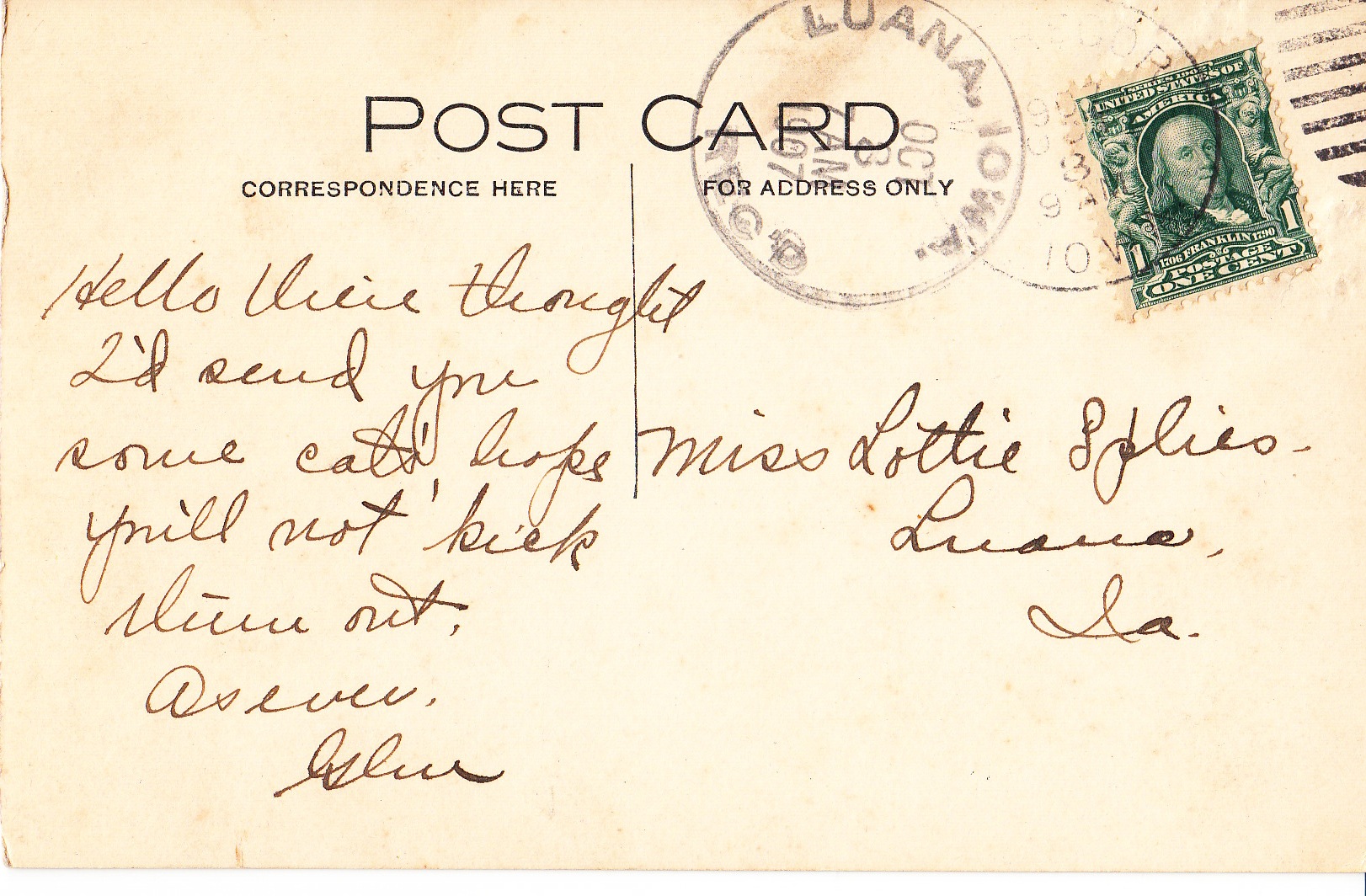 Back of the postcard, postmarked Luana, Iowa, October 1907. Addressed to Miss Lottie Splies.