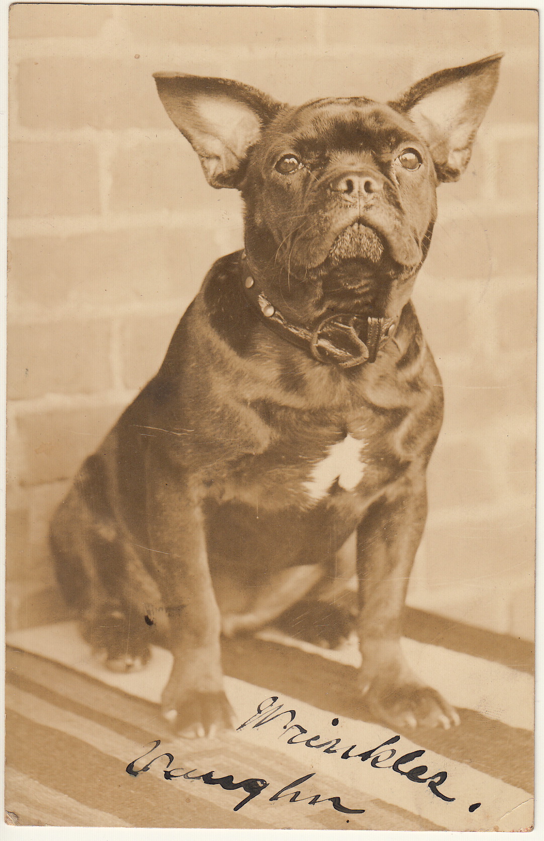 Meet Wrinkles Vaughn, a very fine French Bulldog whose portrait was taken around 1910.  Quickie research suggests that Wrinkles’ owner was 37-year-old Ralph C. Vaughn, who shows up in the U.S. Census of 1910 as a bartender who owned a liquor store and lived in downtown Rochester at 119 East Avenue with his wife, Helen (age 28),  and his widowed aunt Mattie Durfie (age 58).  Vaughn’s fortunes seem to have been mixed.  in 1905, he showed up in the New York Census as a dentist;  by 1920, he was a machinist and his wife was absent from the household.  Since the card doesn’t say anything about the picture, I don’t know who took it, but it is an unusually good postcard portrait.  Whatever Ralph C. Vaughn’s personal tragedies,  he certainly owned a noble — and well cared for — dog!