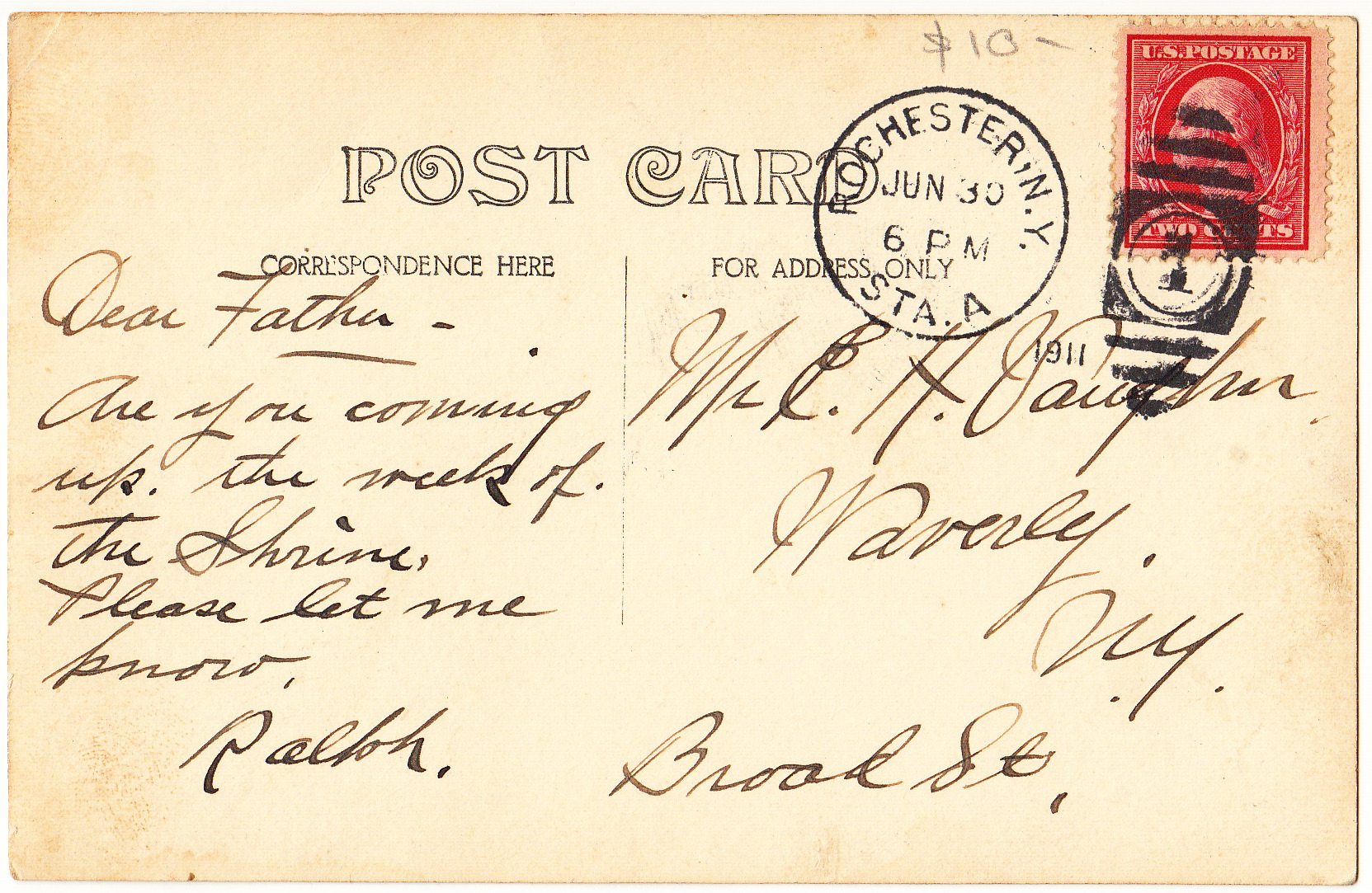 Message side of postcard depicting Wrinkles Vaughn. Mailed from Rochester, New York, by Ralph Vaughn 30 June, ca. 1920.