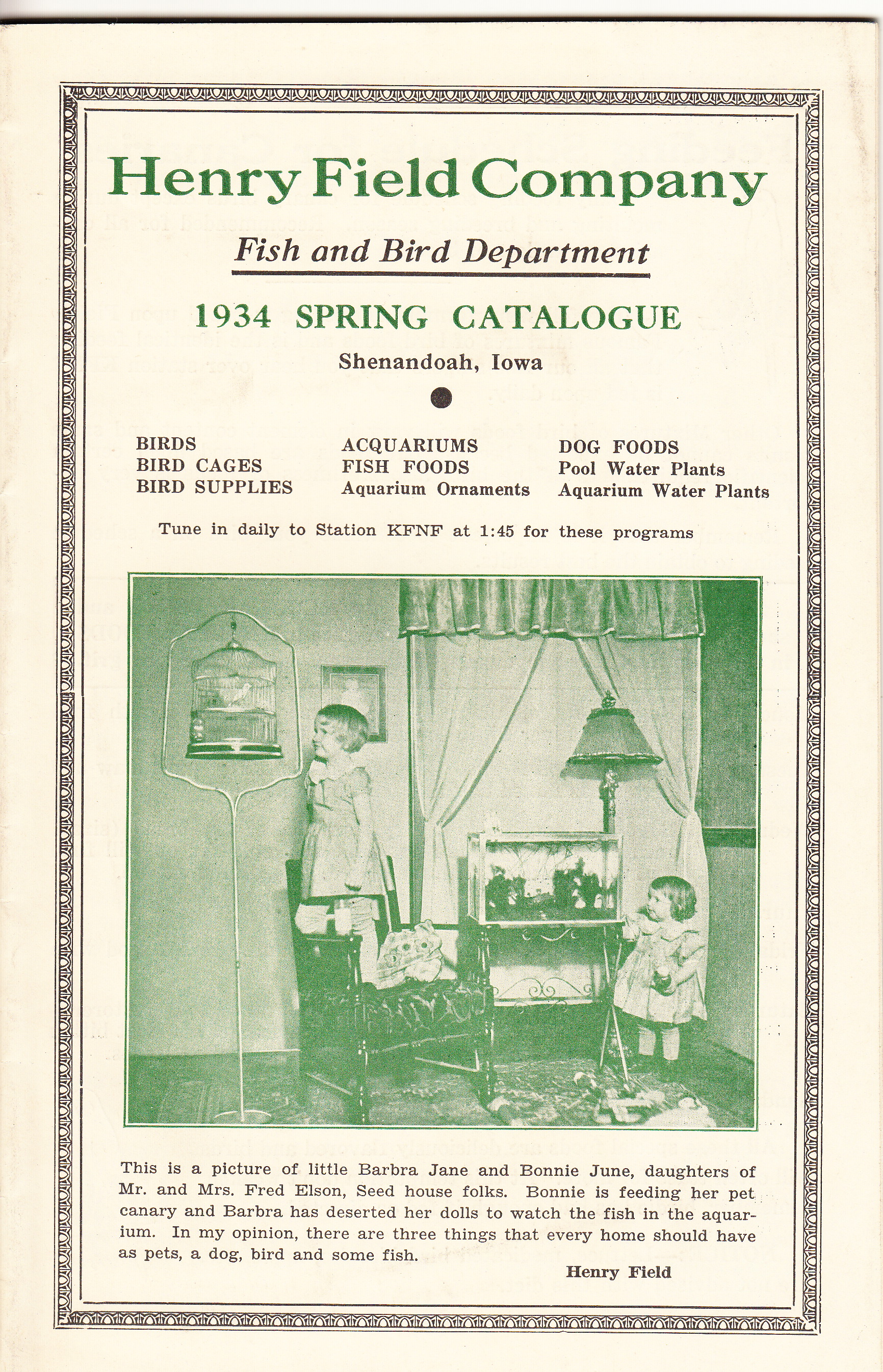 In 1934, the Henry Field Company of Shenandoah, Iowa, published two spring catalogs. One was its seed and plant catalog, representing the largest and oldest part of the business. However, the company’s “Fish and Bird Department” got its own catalog. The cover photo showed Barbra Jane and Bonnie June Elson, daughters of two Field employees, enjoying their pet canary and a tank of fish. “In my opinion,” wrote Mr. Field, “there are three things every home should have as pets, a dog, bird and some fish.” Cats were left out of this equation; since Mr. Field was an old farmer, it’s likely that he still regarded cats as workers rather than companions.