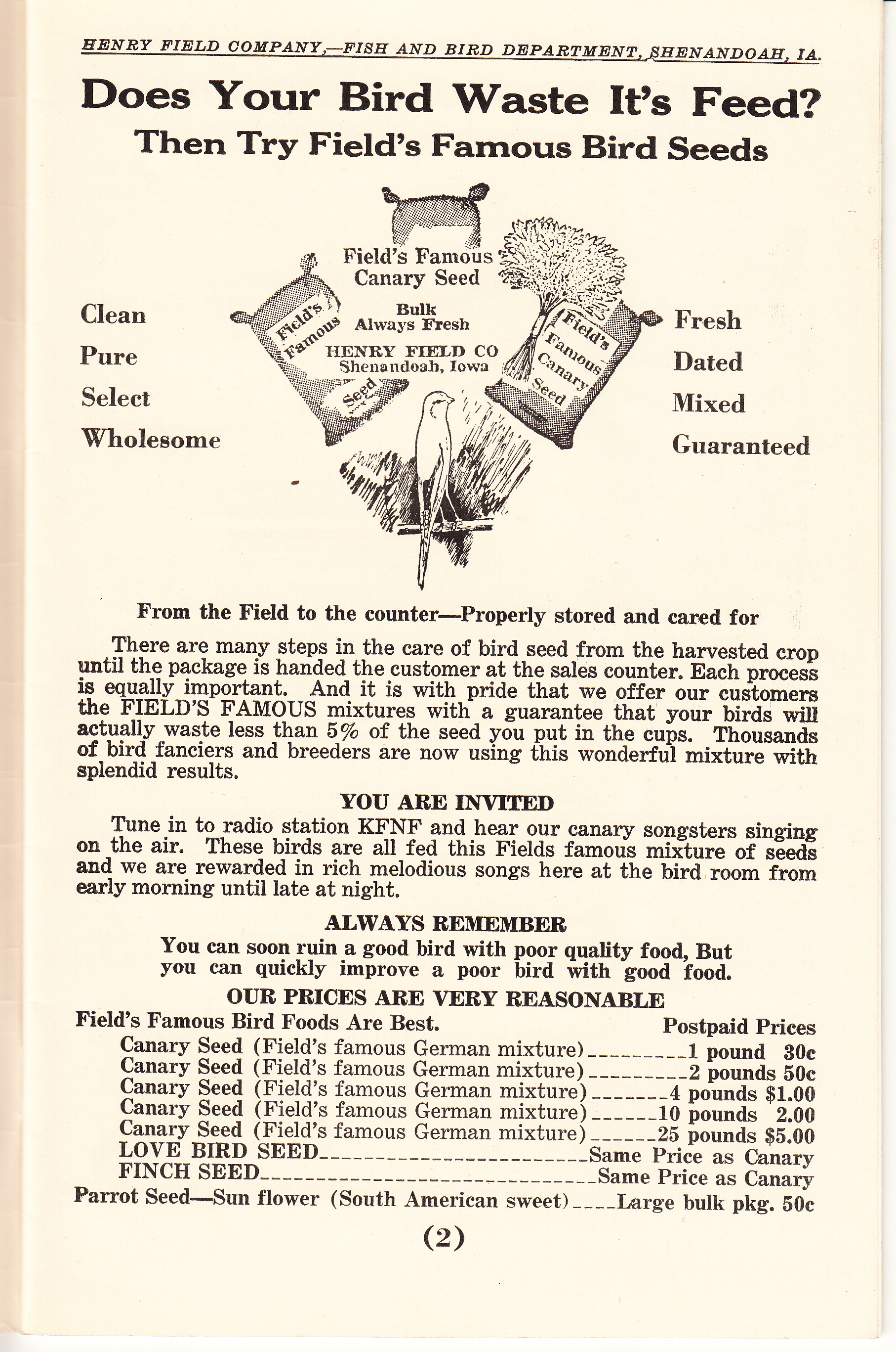 could be heard on KFNF, where Field’s “canary songsters” performed on the air two times a day. “We are rewarded in rich melodious songs here at the bird room from early morning until late at night.”