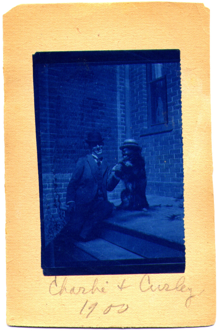 “Charley and Curley 1900” is a cyannotype (a fancy name for a blueprint). A simple form of photographic printing, amateur photographers experimented with it for a couple of decades. This cyannotype isn’t even square, and it has an edge that suggests that the image was torn from a larger piece of sensitized paper. It’s glued to a piece of heavier paper. But don’t you love this picture of two dapper fellows. I’m assuming “Curley” is the dog. He’s wearing a straw boater, a popular summer hat for both men and women.