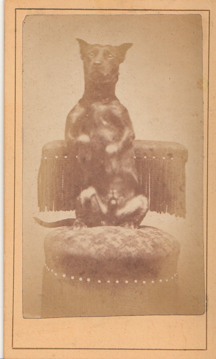 This cdv has been trimmed to fit into an album, Notice that the man’s cheeks have been tinted pink. Both the man and the dog are looking at the photographer, and the little dog, a small female terrier (perhaps a brown-and-black Manchester terrier), has moved a little as she tries to keep her balance.