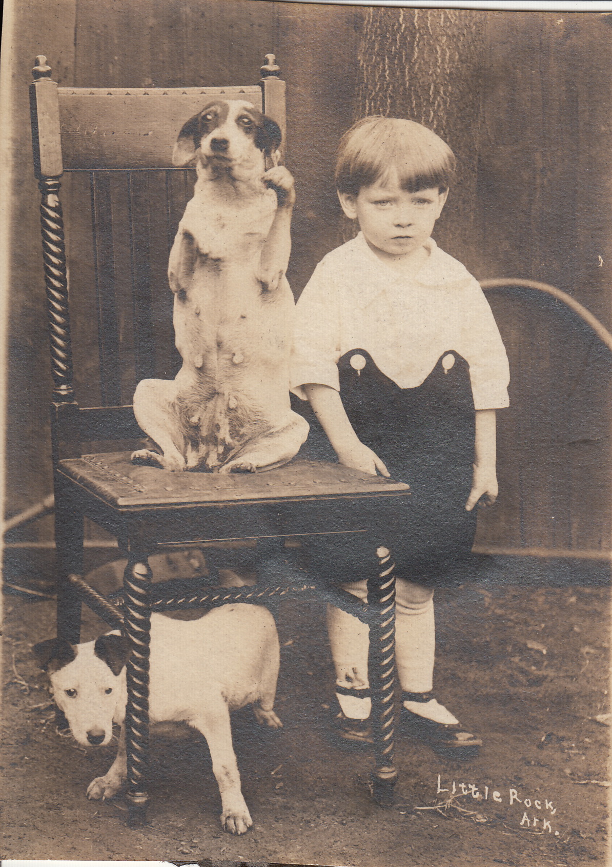 This real photo postcard shows a very little boy dressed in Sunday best short pants, white hose and patent leather “mary janes.” He’s been posed outdoors, against what looks like the side of a barn or shed, and a dining room chair has been brought outside to create the pose with the two dogs. The dog sitting up on the chair has a very appealing expression. She has had puppies, probably repeatedly, since spaying wasn’t available widely until the 1930s.